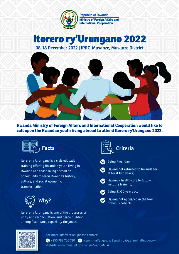 The Ministry of Foreign Affairs and International Cooperation of Rwanda would like to invite Rwandan youth living abroad to attend Itorero ry’Urungano 2022.