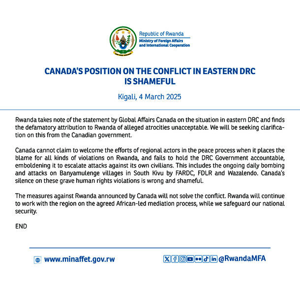 Rwanda takes note of the statement by Global Affairs Canada on the situation in eastern DRC and finds the defamatory attribution to Rwanda of alleged atrocities unacceptable. We will be seeking clarification on this from the Canadian government.