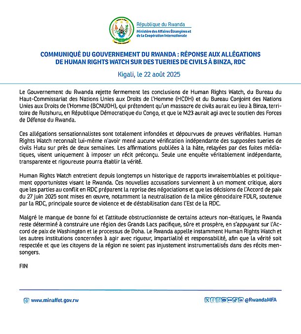 COMMUNIQUÉ DU GOUVERNEMENT DU RWANDA : RÉPONSE AUX ALLÉGATIONS DE HUMAN RIGHTS WATCH SUR DES TUERIES DE CIVILS À BINZA, RDC