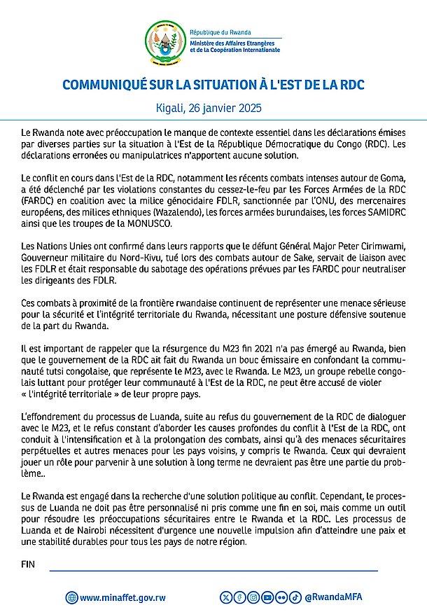 Kigali, 26 janvier 2025 - Le Rwanda note avec préoccupation le manque de contexte essentiel dans les déclarations émises par diverses parties sur la situation à l'Est de la République Démocratique du Congo (RDC). Les déclarations erronées ou manipulatrices n'apportent aucune solution.