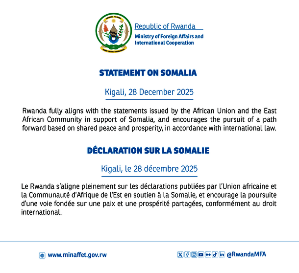 Le Rwanda s’aligne pleinement sur les déclarations publiées par l’Union africaine et la Communauté d’Afrique de l’Est en soutien à la Somalie, et encourage la poursuite d’une voie fondée sur une paix et une prospérité partagées, conformément au droit international.