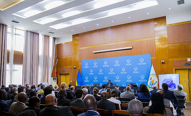 Kigali, 11 October 2023 - Minister Vincent Biruta was joined by Senior Officials from the Ministry in Charge of Emergency Management (MINEMA) and the Rwanda Development Board (RDB) for a Diplomatic Briefing on recent developments in the region, the upcoming 23rd World Travel and Tourism Council Global Summit (WTTC) scheduled for 1-3 November 2023, and other upcoming events in Kigali as well as the refugees' situation.