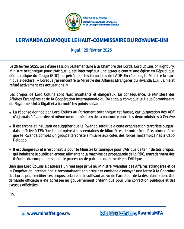 Les propos de Lord Collins sont faux, insultants et dangereux. En conséquence, le Ministère des Affaires Etrangères et de la Coopération Internationale du Rwanda a convoqué le Haut-Commissaire du Royaume-Uni à Kigali et a formulé les points suivants :
