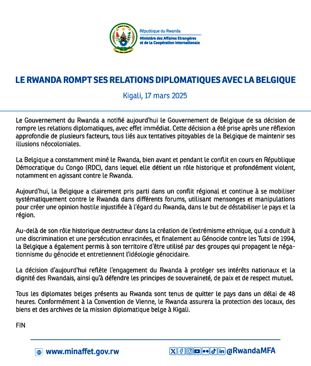 Le Gouvernement du Rwanda a notifié aujourd’hui le Gouvernement de Belgique de sa décision de rompre les relations diplomatiques, avec effet immédiat. Cette décision a été prise après une réflexion approfondie de plusieurs facteurs, tous liés aux tentatives pitoyables de la Belgique de maintenir ses illusions néocoloniales.