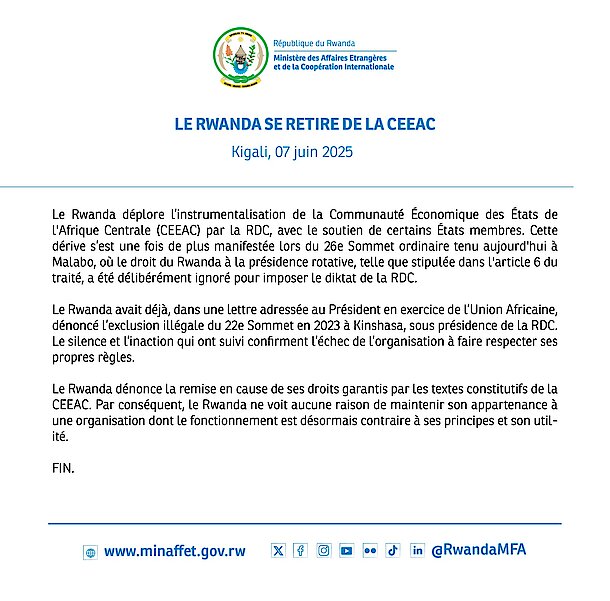 Le Rwanda dénonce la remise en cause de ses droits garantis par les textes constitutifs de la CEEAC. Par conséquent, le Rwanda ne voit aucune raison de maintenir son appartenance à une organisation dont le fonctionnement est désormais contraire à ses principes et son utilité.