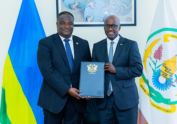 Kigali, 4 November 2024 - Minister Olivier J.P. Nduhungirehe received copies of the letters of credence of H.E. Ernest Yaw Amporful, High Commissioner-Designate of the Republic of Ghana to Rwanda, with residence in Kigali. The Minister congratulated the newly appointed H.C. and commended the continued growing bilateral relations between the two countries.