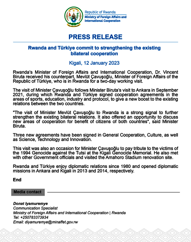 Press release: Rwanda and Türkiye commit to strengthening the existing bilateral cooperation