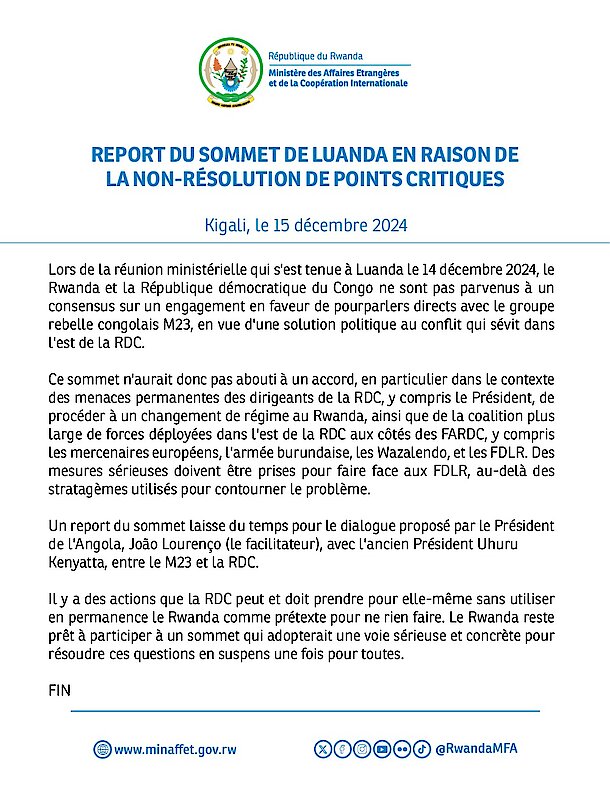 REPORT DU SOMMET DE LUANDA EN RAISON DE LA NON-RÉSOLUTION DE POINTS CRITIQUES