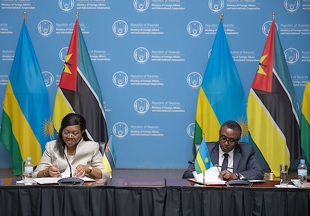 Kigali, 20 October 2022 - Vincent Biruta, Minister of Foreign Affairs and International Cooperation and Arsénia Massingue, Minister of Interior of Mozambique signed an Agreement on the exemption from visa requirements for holders of ordinary passports between Rwanda and Mozambique.