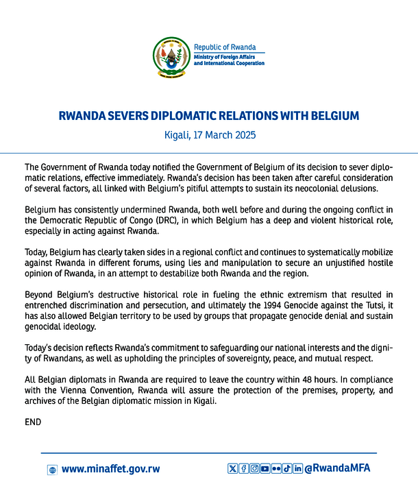 The Government of Rwanda today notified the Government of Belgium of its decision to sever diplomatic relations, effective immediately. Rwanda’s decision has been taken after careful consideration of several factors, all linked with Belgium’s pitiful attempts to sustain its neocolonial delusions.