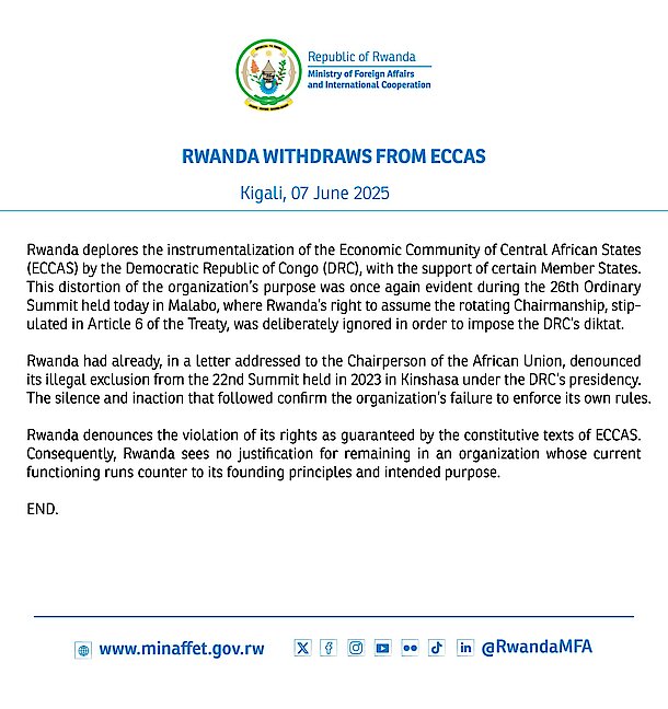 Rwanda denounces the violation of its rights as guaranteed by the constitutive texts of ECCAS. Consequently, Rwanda sees no justification for remaining in an organization whose current functioning runs counter to its founding principles and intended purpose.