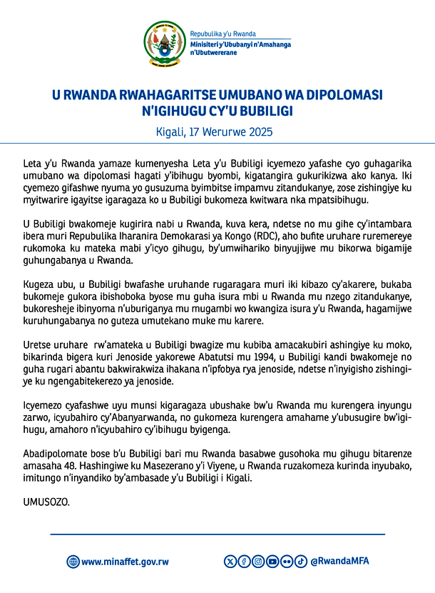 Leta y’u Rwanda yamaze kumenyesha Leta y’u Bubiligi icyemezo yafashe cyo guhagarika umubano wa dipolomasi hagati y’ibihugu byombi, kigatangira gukurikizwa ako kanya. Iki cyemezo gifashwe nyuma yo gusuzuma byimbitse impamvu zitandukanye, zose zishingiye ku myitwarire igayitse igaragaza ko u Bubiligi bukomeza kwitwara nka mpatsibihugu