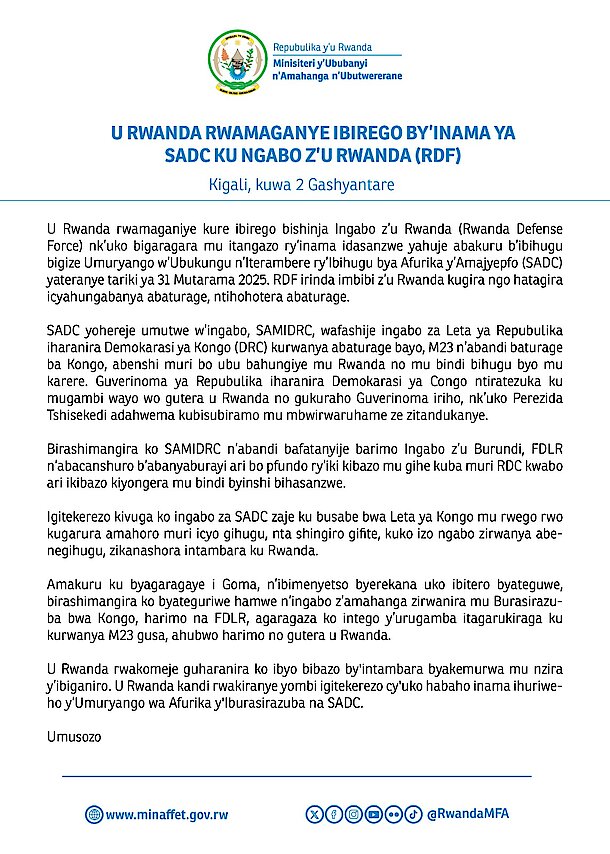 Kigali, ku wa 2 Gashyantare 2025 - U Rwanda rwamaganiye kure ibirego bishinja Ingabo z’u Rwanda (Rwanda Defense Force) nk’uko bigaragara mu itangazo ry’inama idasanzwe yahuje abakuru b’ibihugu bigize Umuryango w’Ubukungu n’Iterambere ry’Ibihugu bya Afurika y’Amajyepfo (SADC) yateranye tariki ya 31 Mutarama 2025. RDF irinda imbibi z’u Rwanda kugira ngo hatagira icyahungabanya abaturage, ntihohotera abaturage.