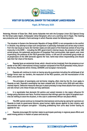 Kigali, 18 February 2025 - As the international community is being called upon to support the mediation process mandated by the African Union and the…