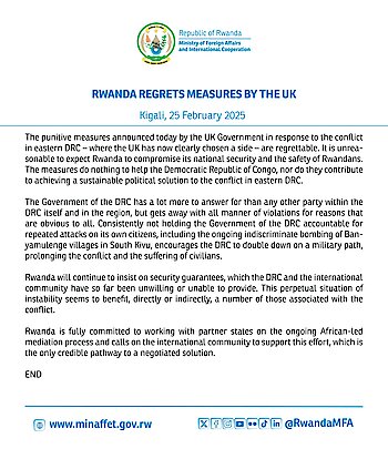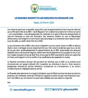 Kigali, 25 February 2025 - The punitive measures announced today by the UK Government in response to the conflict in eastern DRC – where the UK has…
