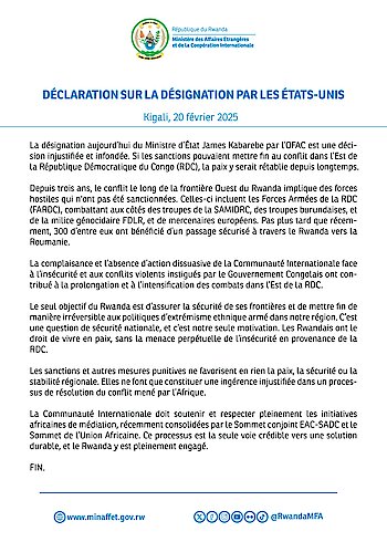Kigali, 20 février 2025 - La désignation aujourd'hui du Ministre d'État James Kabarebe par l'OFAC est une décision injustifiée et infondée. Si les…