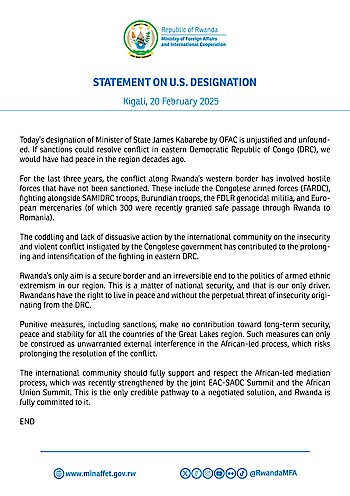 Kigali, 20 February 2025 - Today’s designation of Minister of State James Kabarebe by OFAC is unjustified and unfounded. If sanctions could resolve…