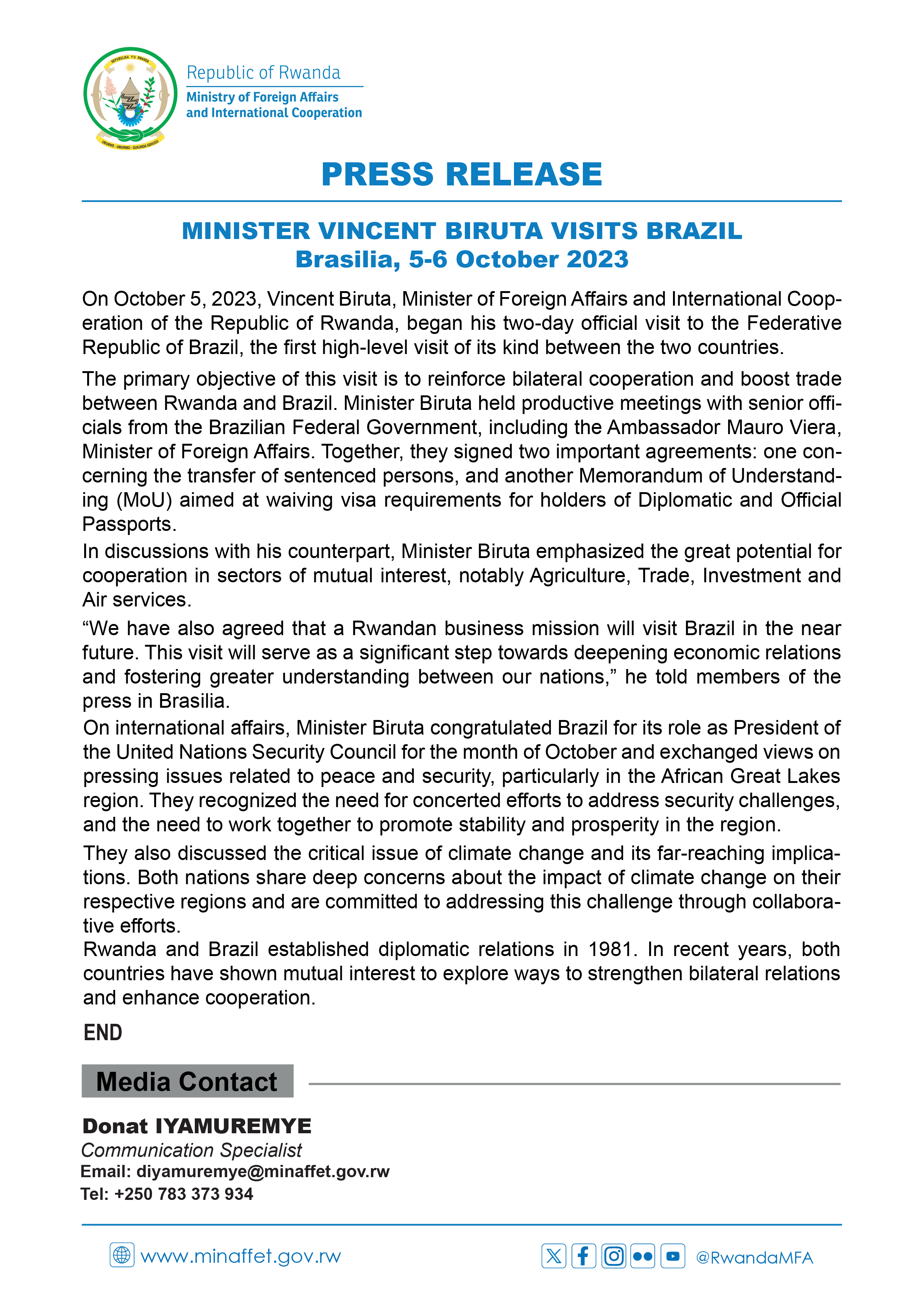 PRESS RELEASE: MINISTER VINCENT BIRUTA VISITS BRAZIL