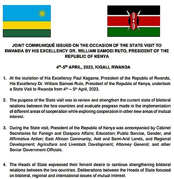 JOINT COMMUNIQUÉ ISSUED ON THE OCCASION OF THE STATE VISIT TO RWANDA BY HIS EXCELLENCY DR. WILLIAM SAMOEI RUTO, PRESIDENT OF THE REPUBLIC OF KENYA