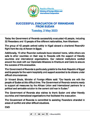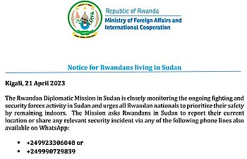 The Rwandan diplomatic Mission in Sudan is closely monitoring the ongoing fighting and security forces activity in Sudan and urges all Rwandan…