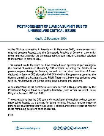 Kigali, 15 December 2024 At the Ministerial meeting in Luanda on 14 December 2024, no consensus was reached between Rwanda and the Democratic…